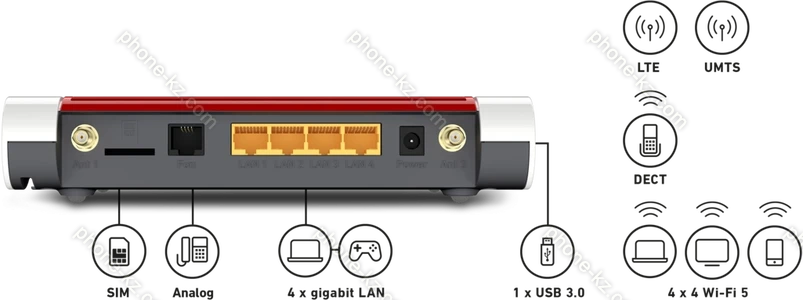 - 1x USB 3.0, 4x Gb LAN, Wi-Fi 5 (WLAN 802.11a/b/g/n/ac), DECT, 1x телефонный аналоговый