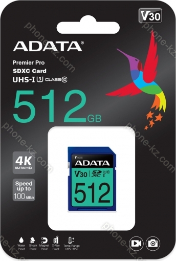 Карта памяти ADATA Premier Pro R100/W80 SDXC 512GB, UHS-I U3, Class 10 (ASDX512GUI3V30S-R) купить недорого в Казахстане: гарантия качества и оптовые цены
