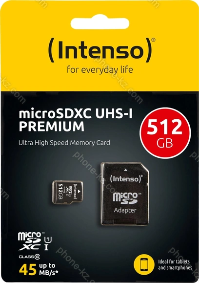 Карта памяти Intenso Premium R45 microSDXC 512GB Kit, UHS-I U1, Class 10 купить недорого в Казахстане: гарантия качества и оптовые цены