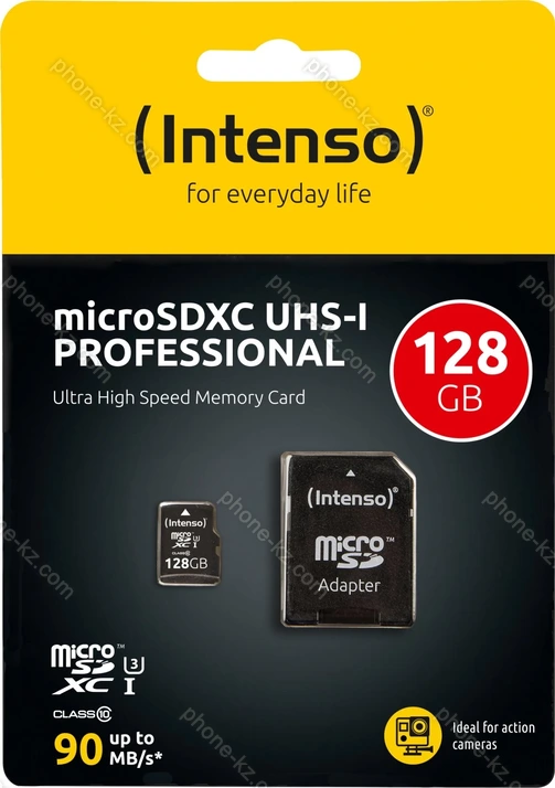 Карта памяти Intenso Professional R90 microSDXC 128GB Kit, UHS-I U1, Class 10 купить недорого в Казахстане: гарантия качества и оптовые цены