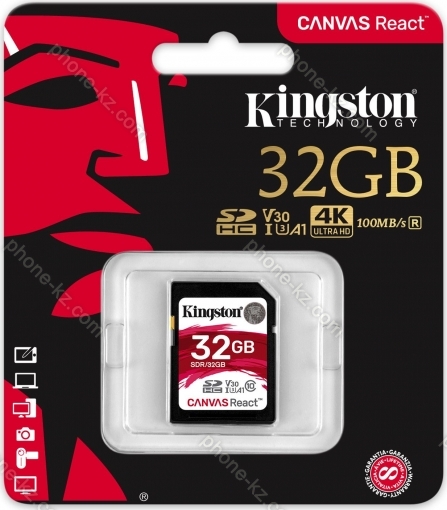 Карта памяти Kingston Canvas React R100/W70 SDHC 32GB, UHS-I U3, Class 10 (SDR/32GB) купить недорого в Казахстане: гарантия качества и оптовые цены
