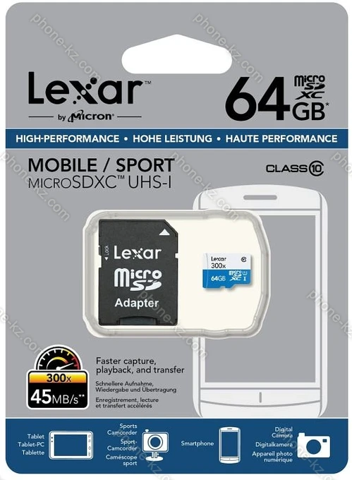 Карта памяти Lexar 300x R45 microSDXC 64GB, UHS-I, Class 10 купить недорого в Казахстане: гарантия качества и оптовые цены