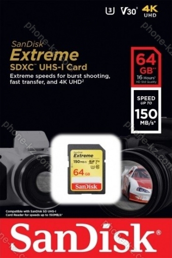 Карта памяти SanDisk Extreme R150/W60 SDXC 64GB, UHS-I U3, Class 10, Казахстан |
