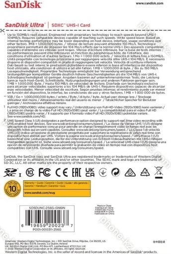 Карта памяти SanDisk Ultra R150 SDXC 256GB, UHS-I U1, Class 10, Казахстан |