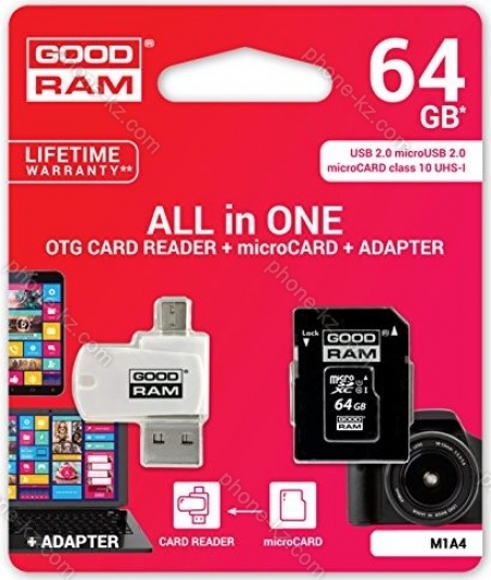 Карта памяти goodram M1A4 R60 microSDXC 64GB Kit, UHS-I, Class 10 (M1A4-0640R11) купить недорого в Казахстане: гарантия качества и оптовые цены